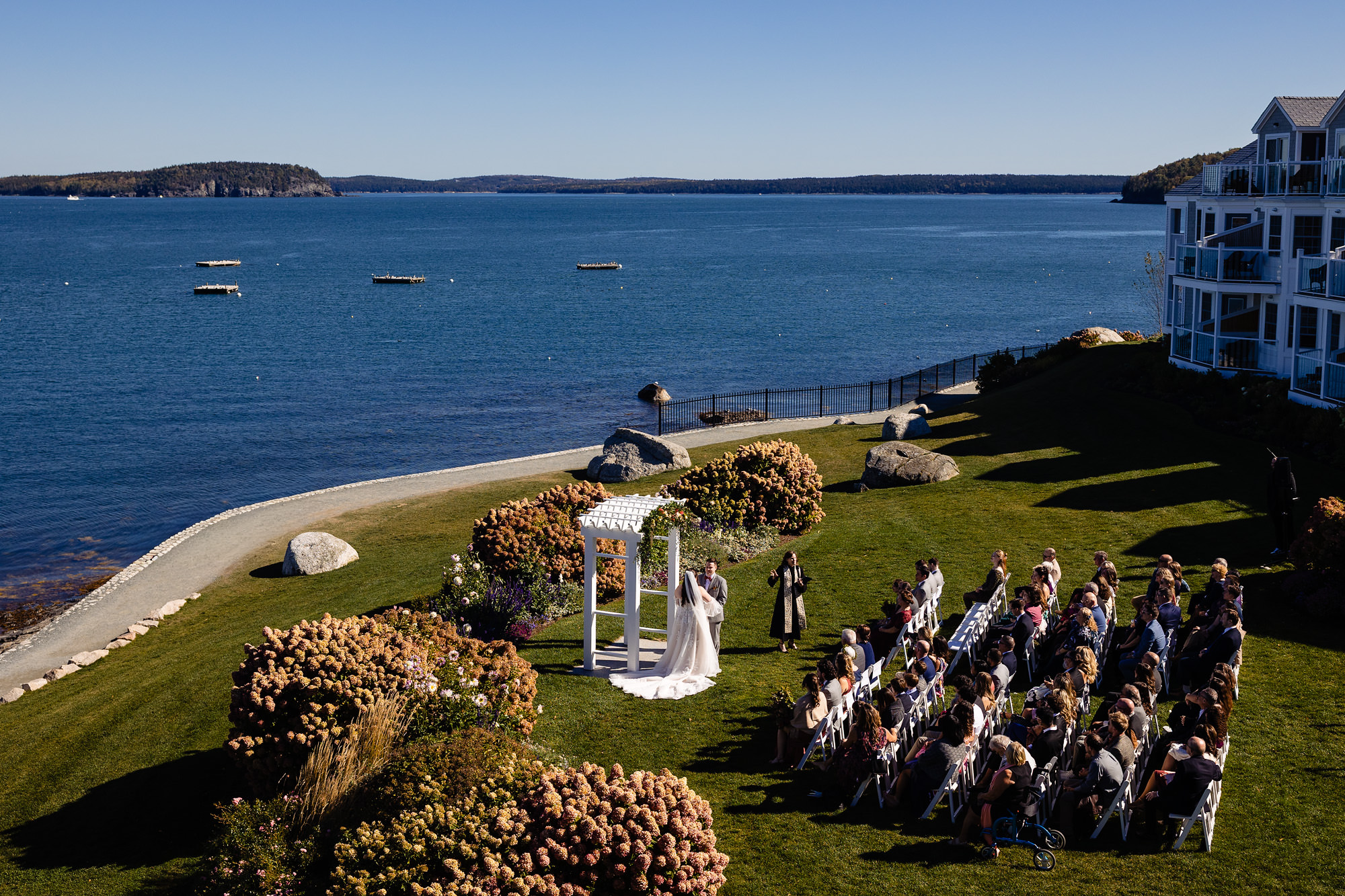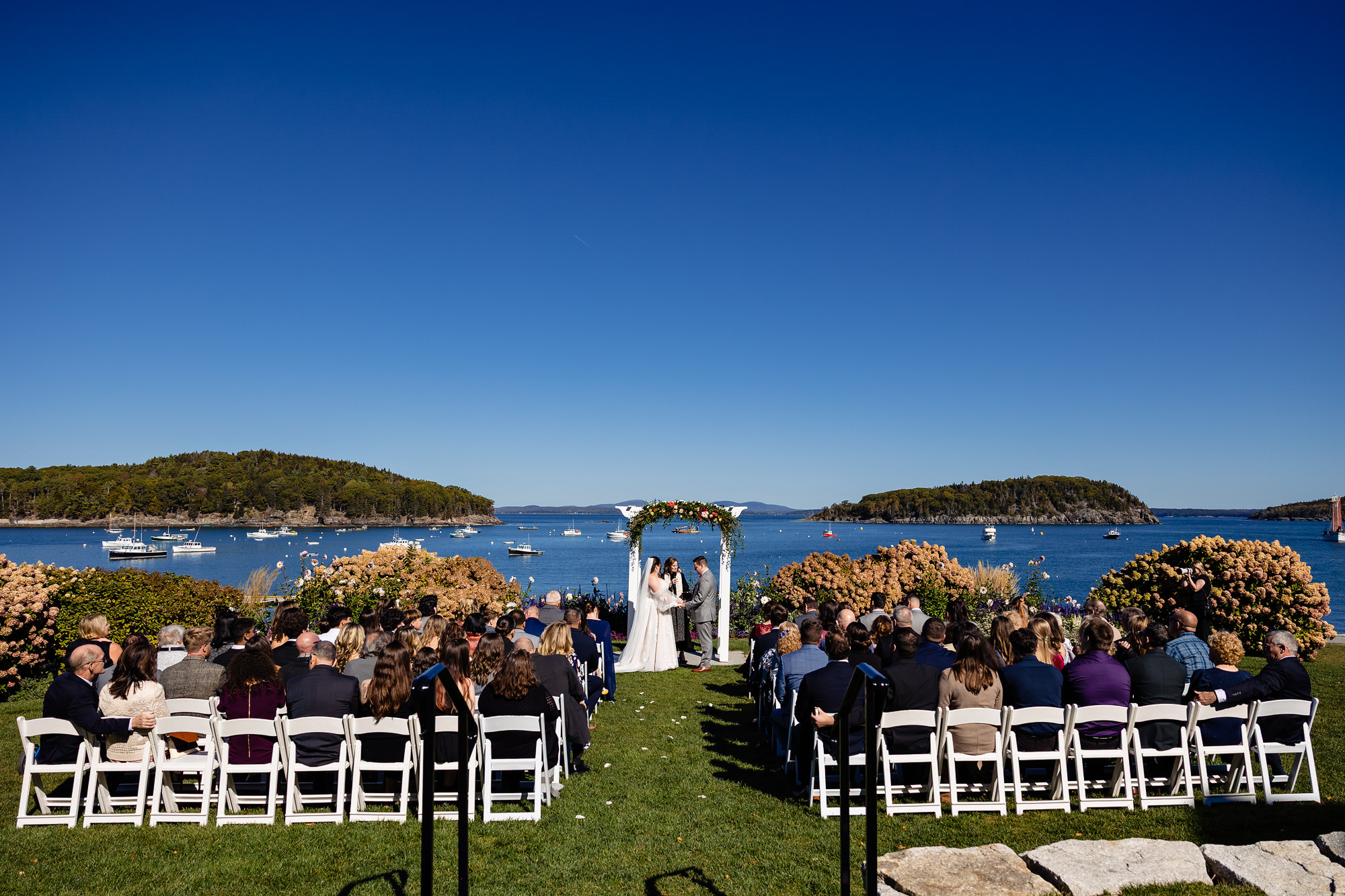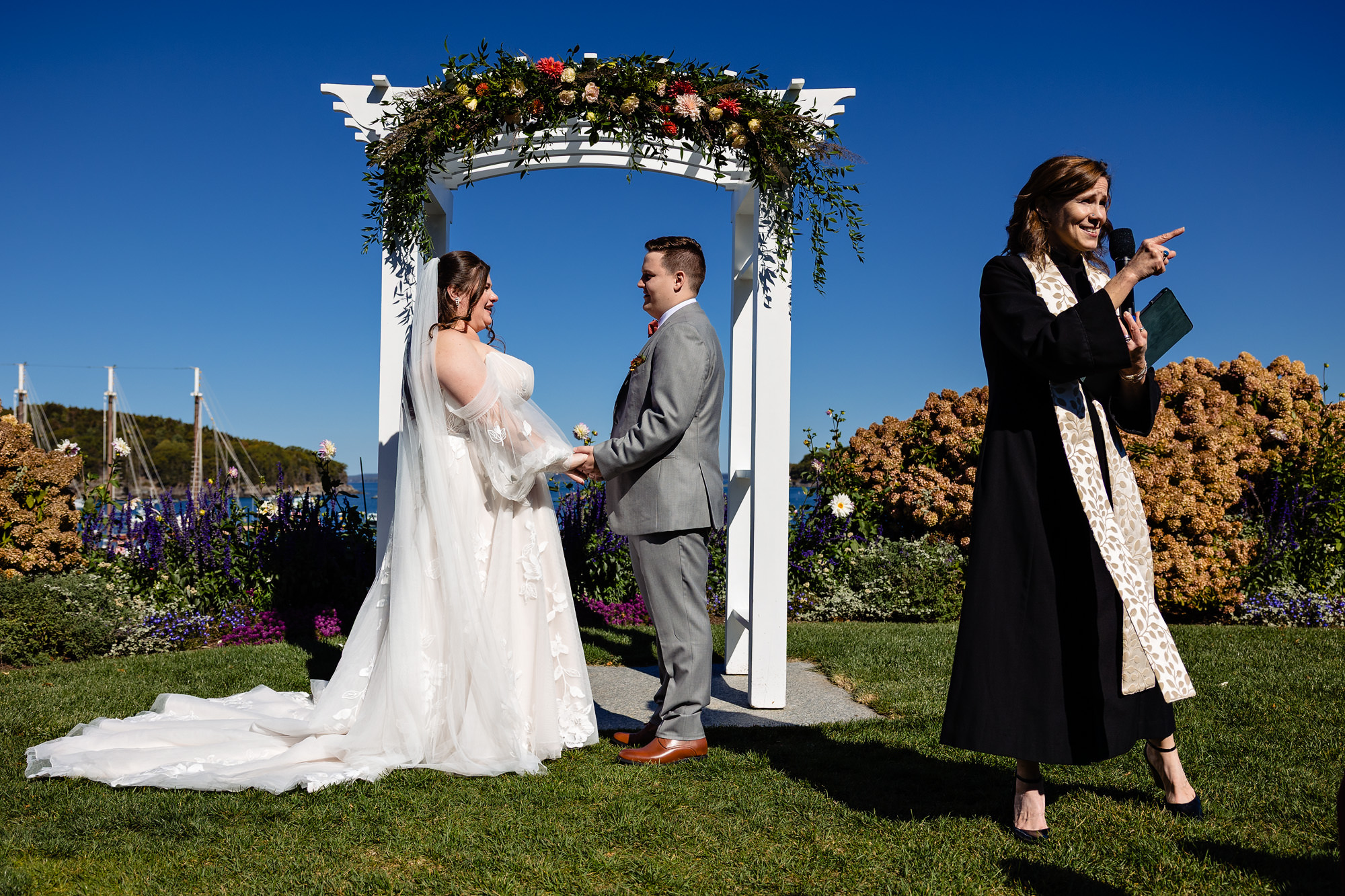 Amanda and Matt started their wedding day at sunrise, where they met some of their guests for a dip at Sand Beach. While I didn’t join them for that portion of their day (although I wish I had, one of my favorite things to do during the colder months in Maine is to jump into the ocean!), they made sure to get a group photo. I joined them, a few hours later, for the tail end of getting ready, and after a first look in Bar Harbor Inn’s gardens, we gathered for their ceremony, overlooking Frenchman Bay. Erika Hewitt, one of my favorite Maine wedding officiants, proceeded over the ceremony, and she delivered per usual, with a heartwarming ceremony that made me love Amanda and Matt all the more.
