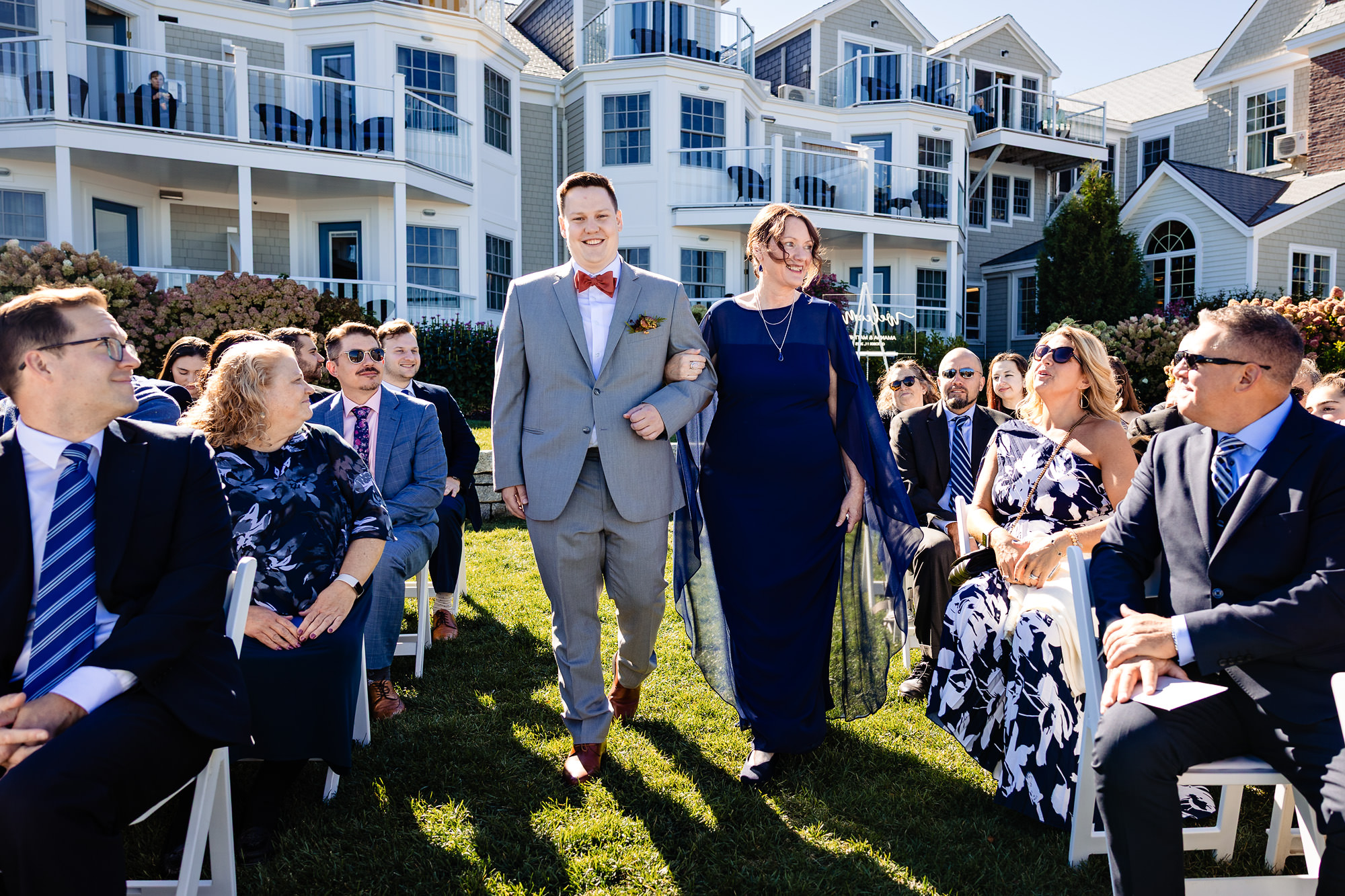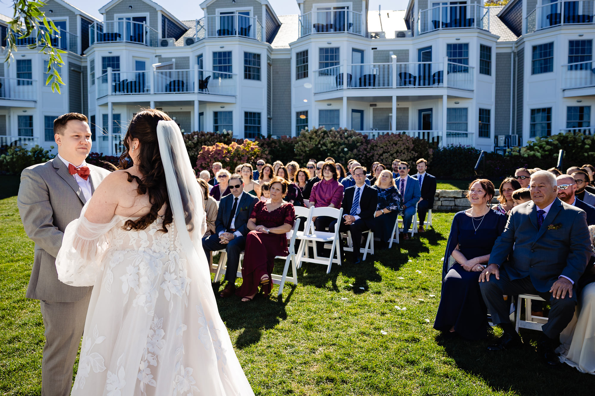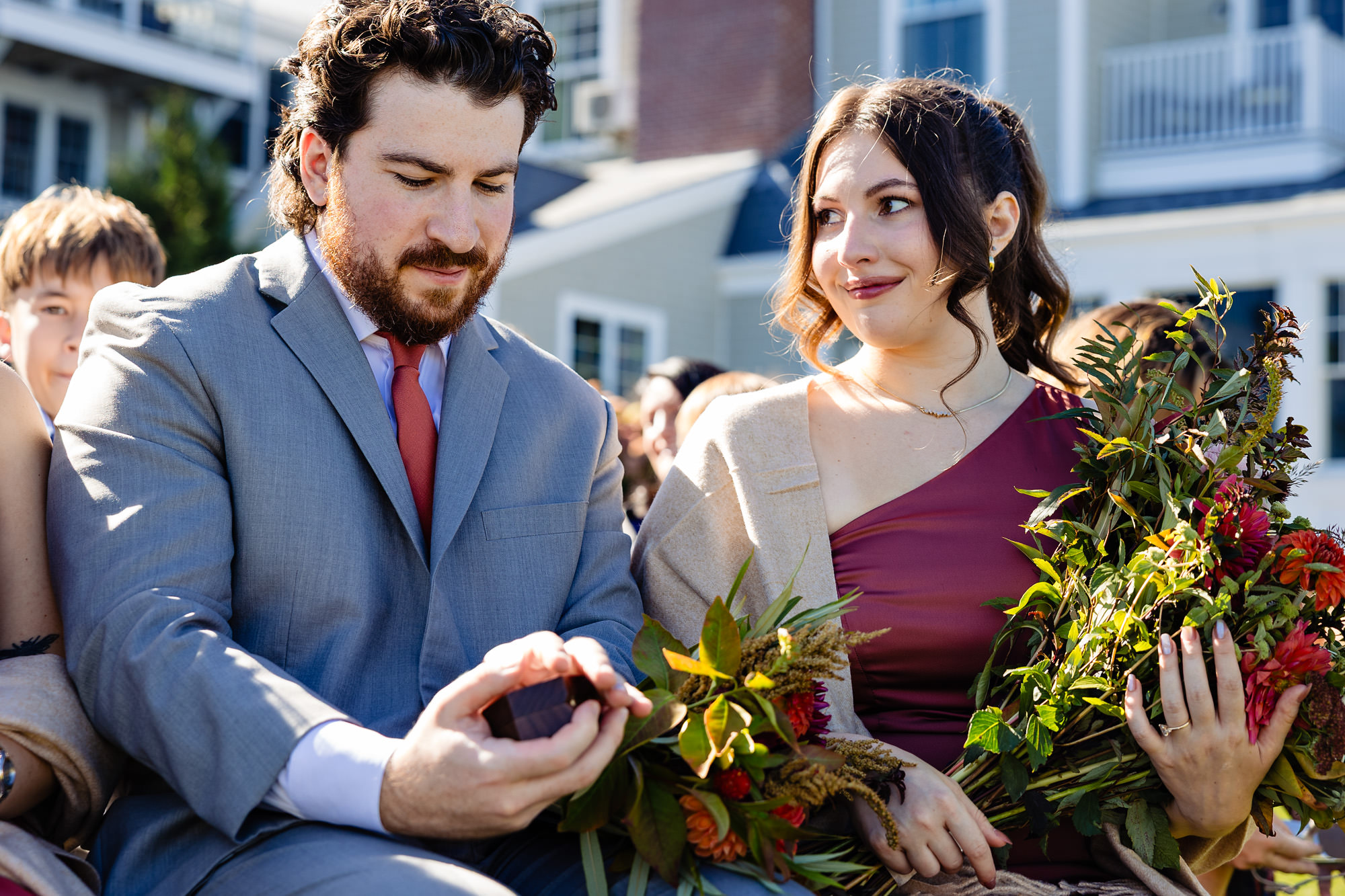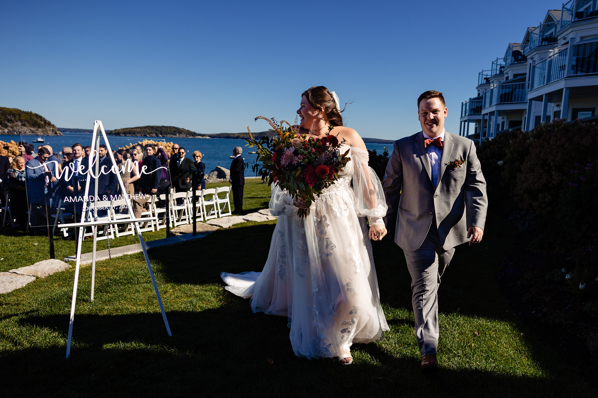 Amanda and Matt started their wedding day at sunrise, where they met some of their guests for a dip at Sand Beach. While I didn’t join them for that portion of their day (although I wish I had, one of my favorite things to do during the colder months in Maine is to jump into the ocean!), they made sure to get a group photo. I joined them, a few hours later, for the tail end of getting ready, and after a first look in Bar Harbor Inn’s gardens, we gathered for their ceremony, overlooking Frenchman Bay. Erika Hewitt, one of my favorite Maine wedding officiants, proceeded over the ceremony, and she delivered per usual, with a heartwarming ceremony that made me love Amanda and Matt all the more.