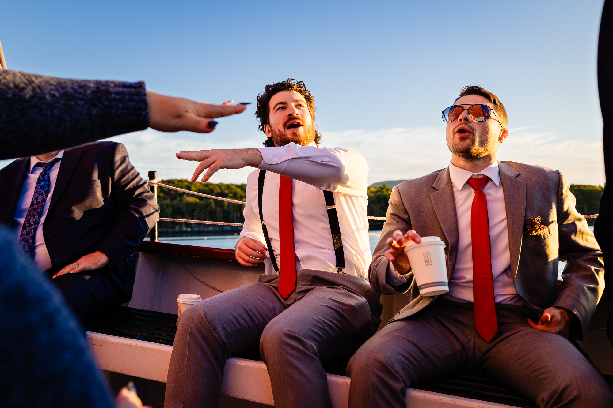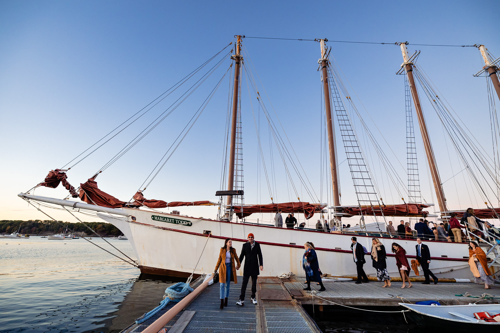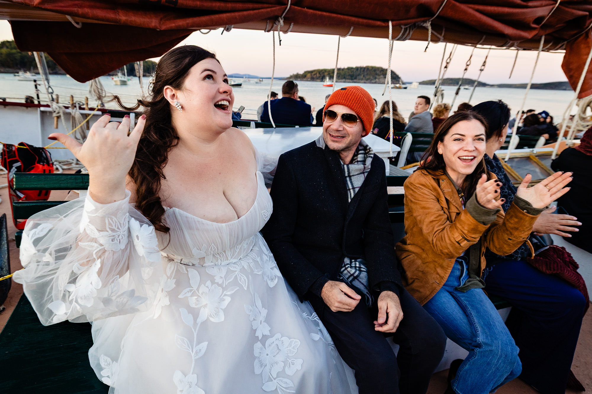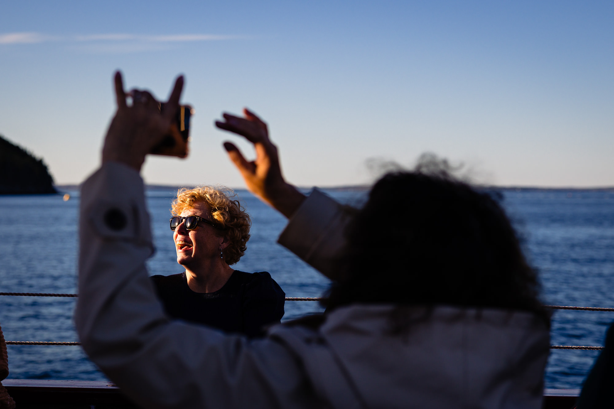 Upon the end of Amanda and Matt’s reception, we all boarded the Margaret Todd, an iconic schooner that you’ve likely seen before if you’ve ever visited Bar Harbor. It sails around the harbor every day, and it’s red sails contrast beautifully against the blue sky. For 1 1/2 hours, we all sailed around the harbor, and the sail was timed perfectly so the sun set right before we debarked. There’s nothing like experiencing Bar Harbor from the water, and our sunny, blue-bird day meant that we had the prettiest golden hour light, and it was clear that guests were enjoying cozying up under blankets and soaking up the view.