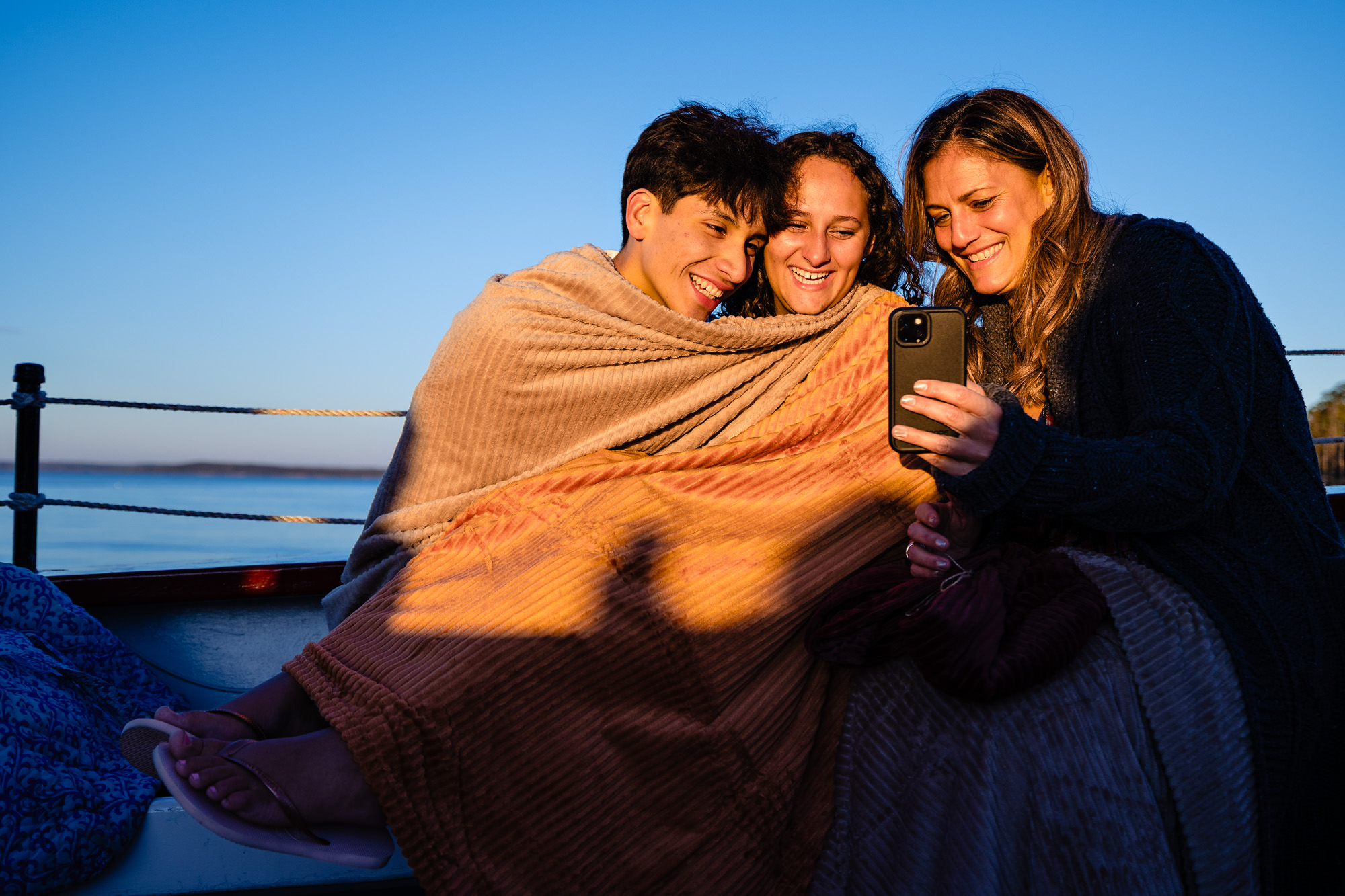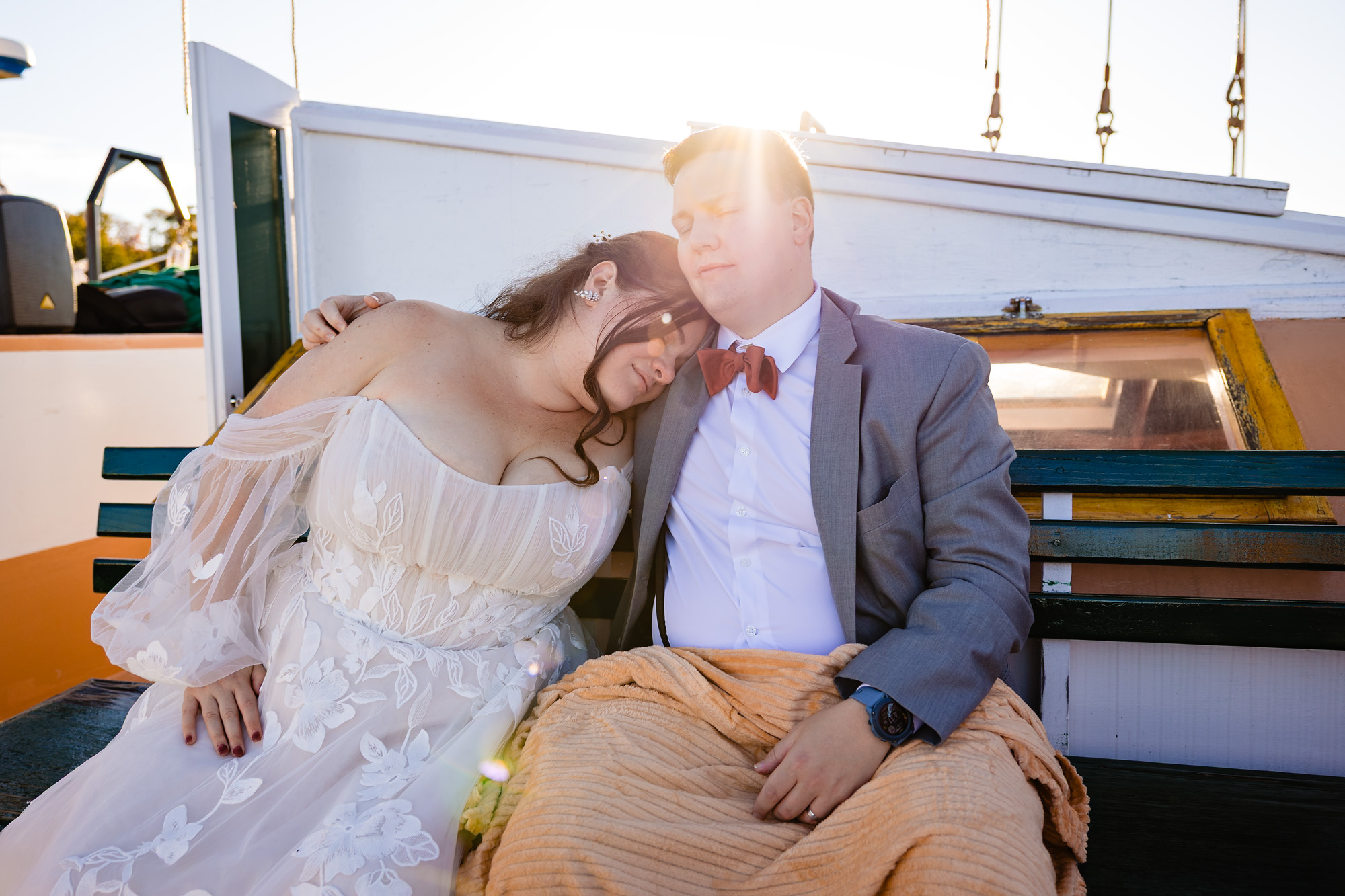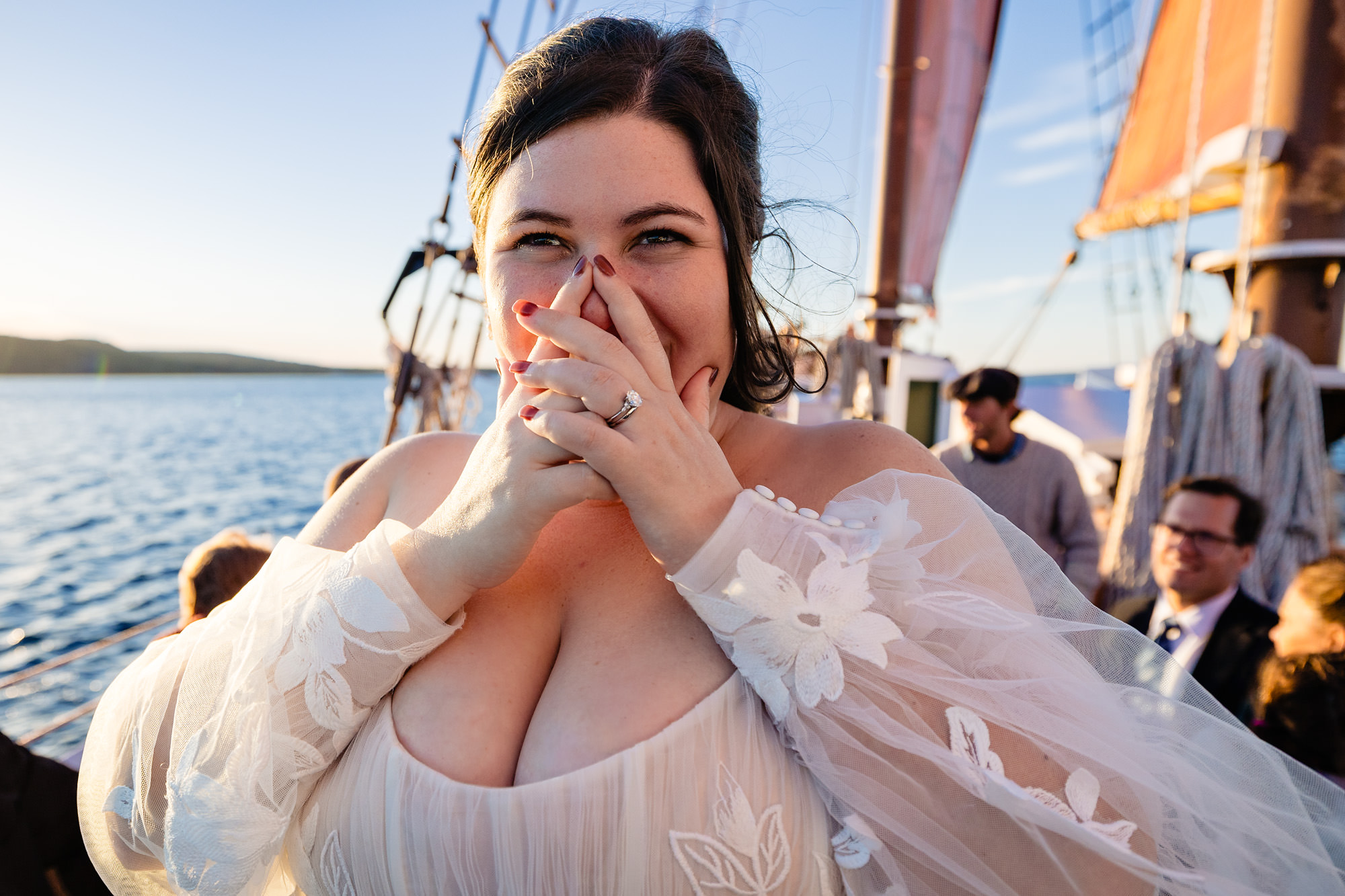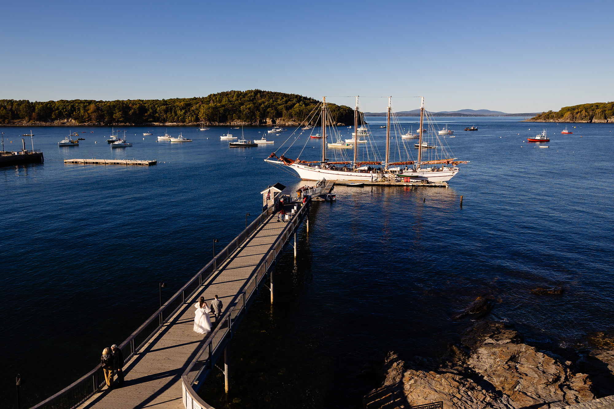 Upon the end of Amanda and Matt’s reception, we all boarded the Margaret Todd, an iconic schooner that you’ve likely seen before if you’ve ever visited Bar Harbor. It sails around the harbor every day, and it’s red sails contrast beautifully against the blue sky. For 1 1/2 hours, we all sailed around the harbor, and the sail was timed perfectly so the sun set right before we debarked. There’s nothing like experiencing Bar Harbor from the water, and our sunny, blue-bird day meant that we had the prettiest golden hour light, and it was clear that guests were enjoying cozying up under blankets and soaking up the view.